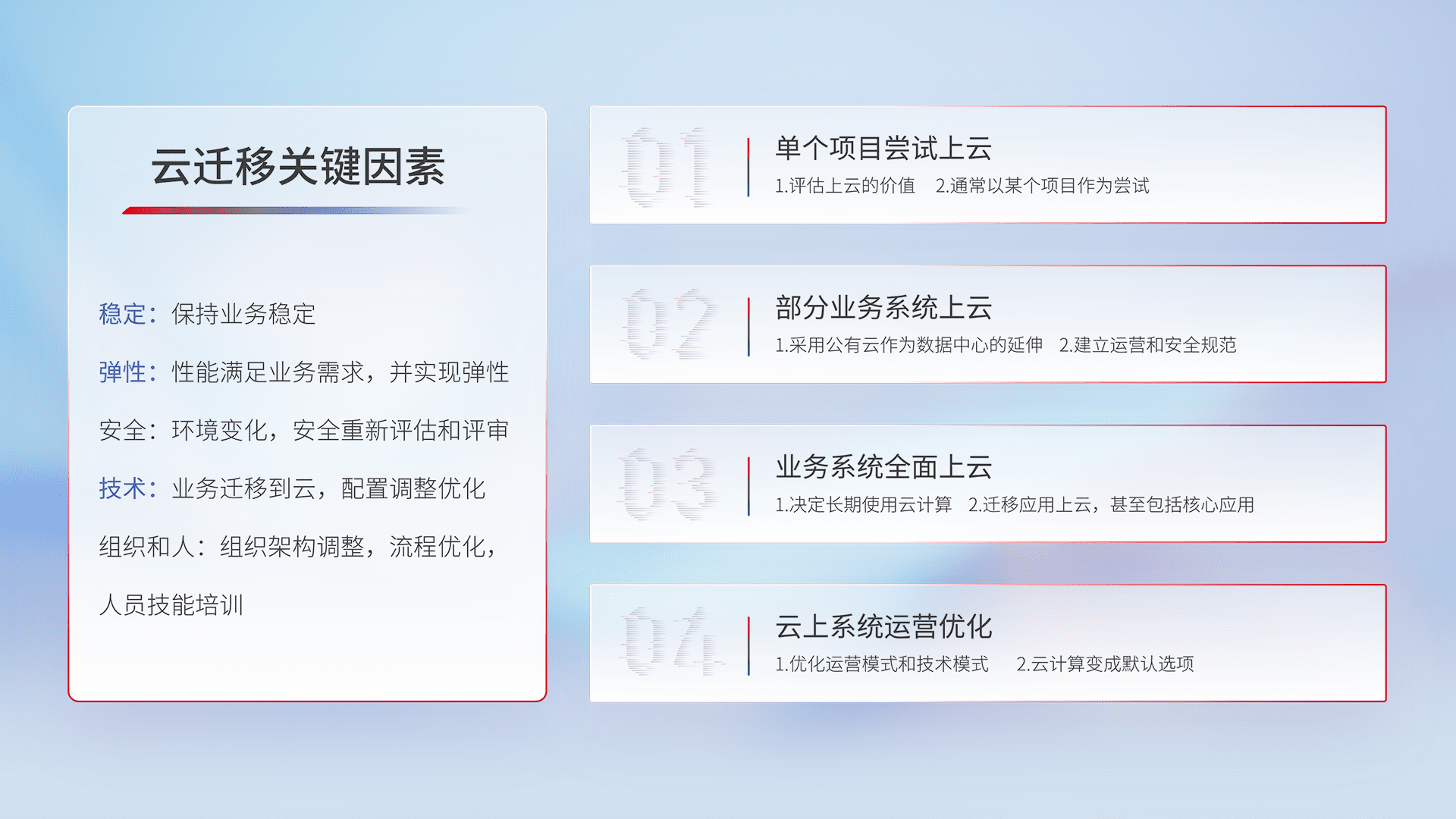 结合实际业务,,从规划设计、、云平台选型、、云原生改造、、数据迁移、、、集成交付,,迁移全过程为客户识别最佳上云路径,,做好风险识别管理,,,,设计网络架构、、、、身份权限、、、、安全审计合规、、、、操作审计、、、、日志审计、、监控告警策略、、多站点容灾设计等,,对云上基础设施进行整体规划,,,,提升IT治理水平,,,,以满足弹性、、高可用、、、高性能的需求。。