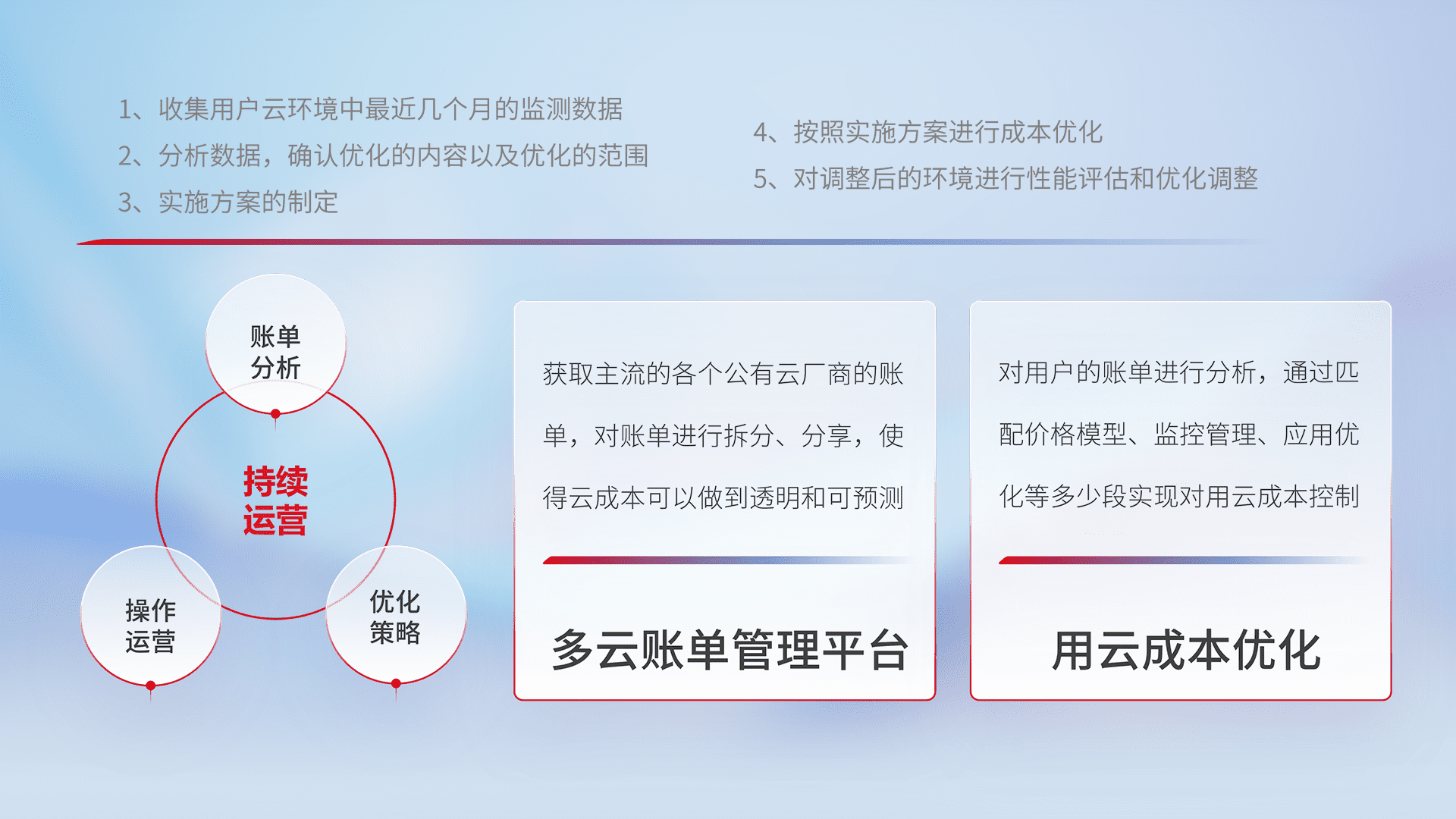 通过多云纳管,,,以统一的资源数据模型把客户的云资源进行抽象和封装,,,进而实现对多云资源的统一操作,,,保障云资源管理的可靠性、、稳定性与可用性。。。量身定制化运维内容,,,配置、、、开发运维、、、补丁管理、、备份、、监控、、、、认证和访问管理、、、、审计和日常巡检等,,,,保障在用云过程中的可靠度,,,稳定度以及高可用率。。