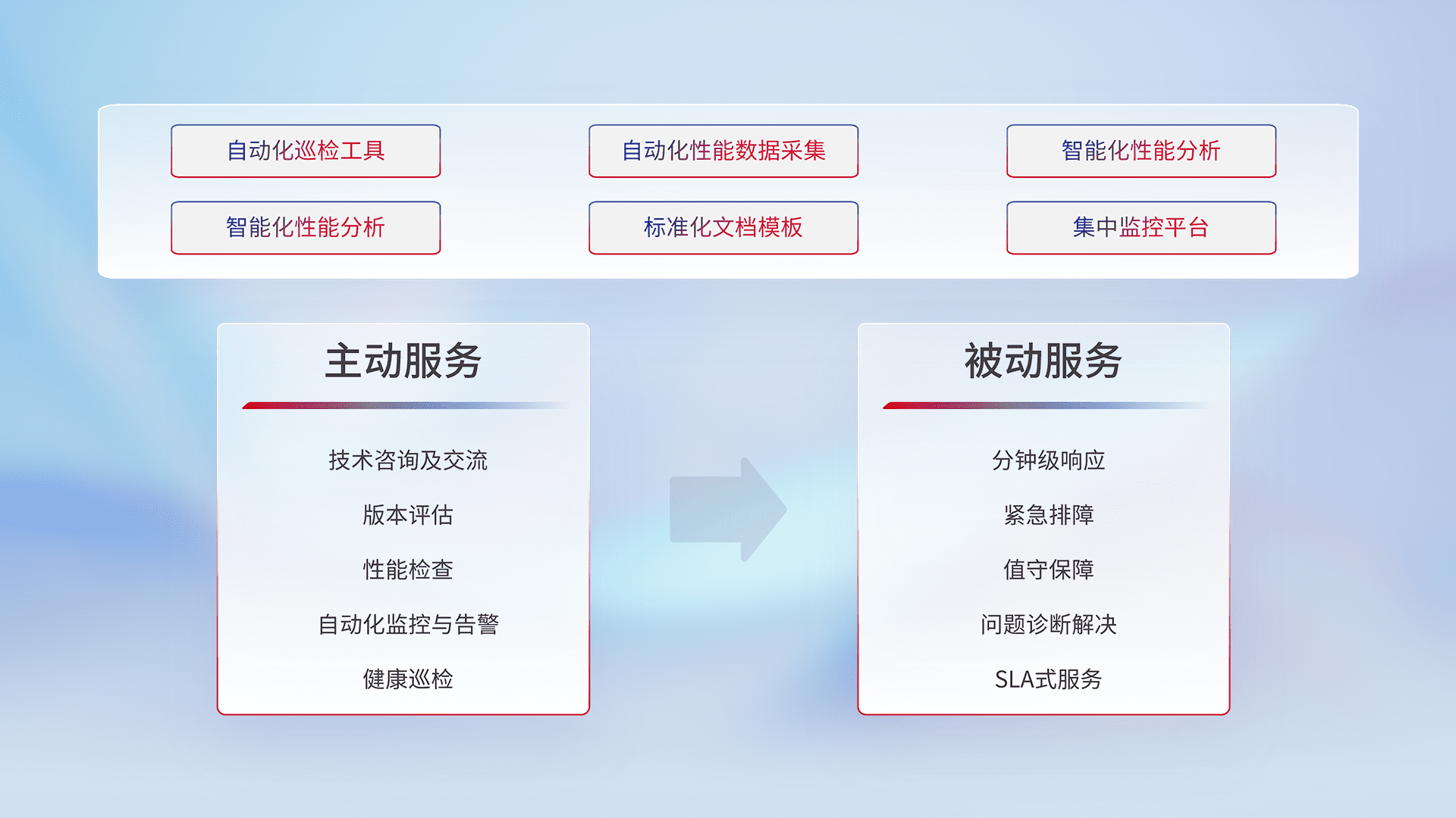 智能化工具和标准化文档,,保障服务质量,,,提供主动服务(包含技术咨询、、、版本评估、、、性能检查、、、、自动化监控与告警、、、健康巡检)和被动服务包含(分钟级响应、、、、紧急排障、、、、值守保障、、、、问题诊断解决、、、、SLA服务)。。。